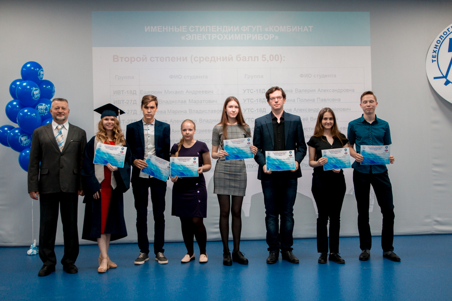 Также по традиции в этот праздничный день по итогам летней экзаменационной сессии 2018-2019 учебного года заместитель генерального директора по управлению персоналом Сергей Александрович Чепелев наградил лучших студентов именной стипендией ФГУП «Комбинат «Электрохимприбор». Обладателями свидетельств первой, второй и третьей степени за выдающиеся успехи в освоении образовательных программ стали 36 студента института.