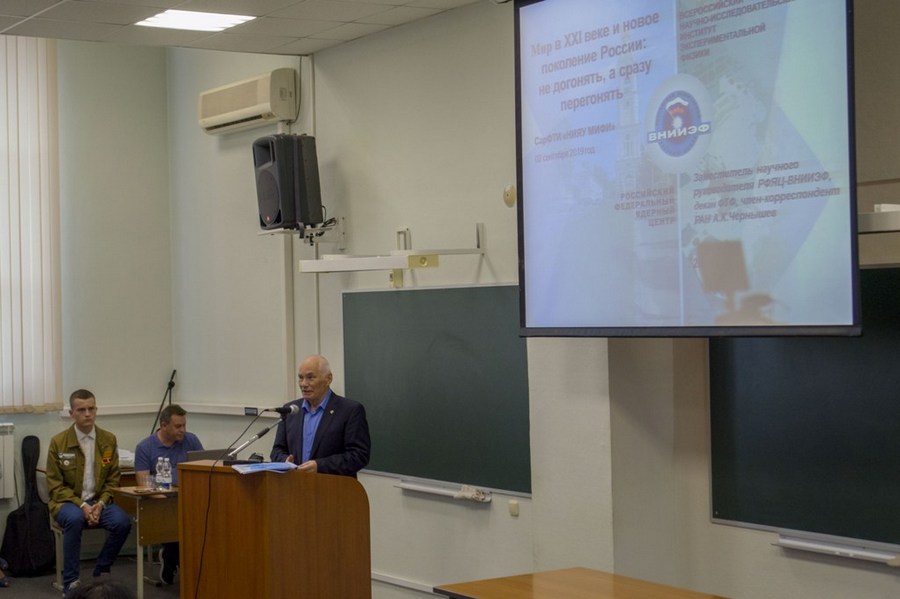 Очень важно начать первый учебный день первокурсников Саровского физтеха, базового вуза ядерного центра «ВНИИЭФ», с введения в историю отрасли и города. Рассказ об ученых и руководителях Атомного проекта — создателях ядерного щита России, фактическая информация о прямой связи КБ-11 – Арзамаса-16 – Сарова с юбилейными событиями, посвящёнными испытаниям первой отечественной атомной бомбы РДС-1, познакомили их с исторической миссией «закрытого» ЗАТО Саров, в котором студентам, среди которых половину составляют иногородние ребята, предстоит учиться и работать.