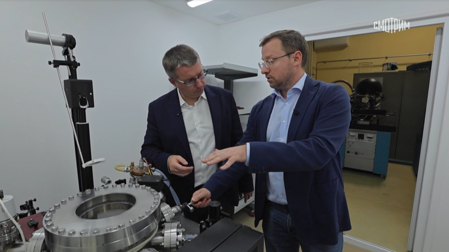 Журналист Антон Подковенко и заведующий кафедрой физико-технических проблем метрологии Петр Борисюк в эфире программы "Время науки" ("Россия-24")