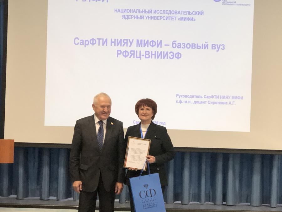 Владимир Булавин поблагодарил коллектив вуза за работу и вручил руководителю СарФТИ памятную медаль Совета Федераций и Благодарственное письмо «За значительный вклад в образовательную деятельность, подготовку высококвалифицированных кадров, сохранение традиций высшей школы, достигнутые успехи в научно-исследовательской и педагогической деятельности и в связи с 80-летием атомной отрасли России».
