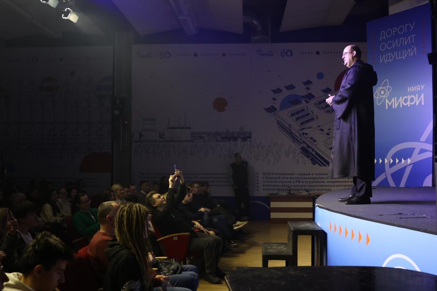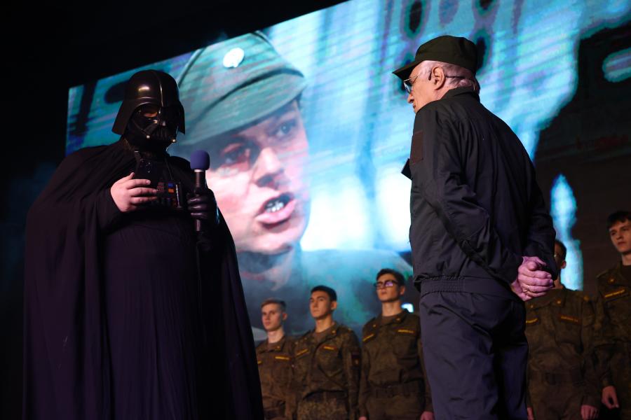 Ректор МИФИ Владимир Шевченко появился в образе галактического императора, и обратился к собравшимся в зале со словами, что в них пребывает сила - «сила вашего таланта, вашего трудолюбия, ваших амбиций, вашего желания изменить мир и оставить по себе великую добрую память».