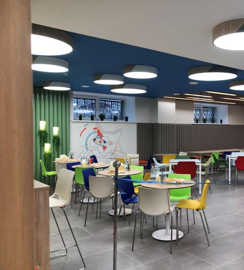 На одной из стен обновленного пространства поселился знаменитый МИФИческий кот, который будет наблюдать, все ли студенты хорошо и плотно перекусили и готовы ли они к суровым будням учебного дня.