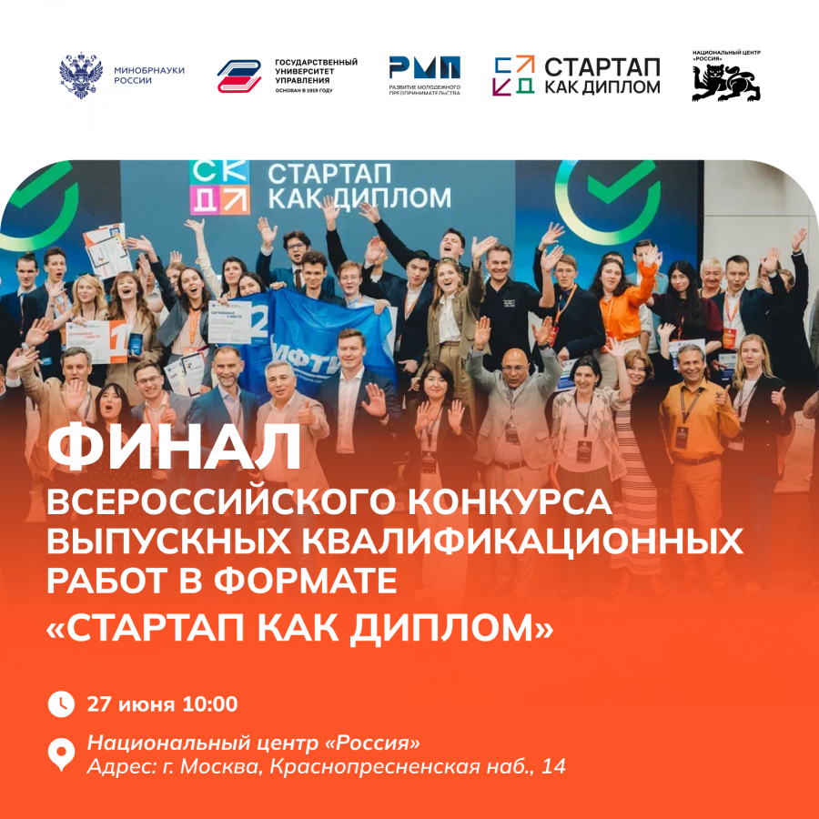 27 июня приглашаем вас на яркое завершение Конкурса 2025 года. Главное событие студенческого предпринимательства пройдёт в Национальном центре «Россия» — на самой масштабной площадке страны.