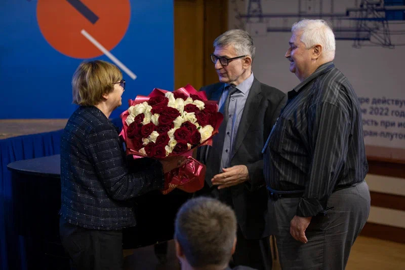 Научный руководитель НИЯУ МИФИ Михаил Стриханов вручает цветы Юлии Мокеровой